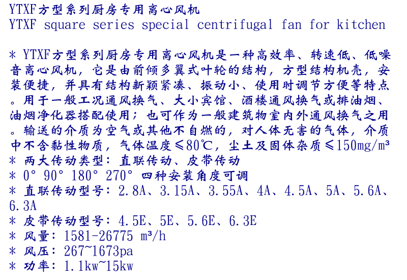 YTXF方型系列廚房專用離心風機是一種高效率、轉速低、低噪音離心風機,它是由前傾多翼式葉輪的結構,方型結構機殼,安裝便捷。