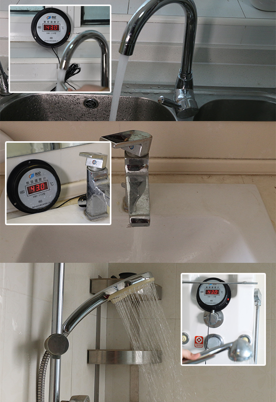 家中日常用水一般都至少兩三個用水點,那么這款燃氣熱水器可以滿足家中多用水點的熱水供應嗎?為測試出水點的溫度,我們把家中廚房水龍頭、盥洗間水龍頭、淋浴噴頭同時開。