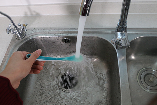 基本上打開水龍頭一兩秒后就能感受到熱水了。把感溫勺放到水龍頭下沖洗幾秒鐘,拿開之后,可以發現感溫勺的顏色變淺了。